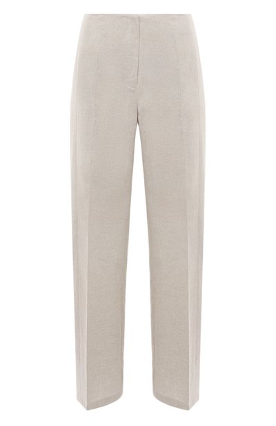 Брюки молочного цвета станут основой комплектов разной степени сложности. Наши стилисты предлагают носить их с парным жакетом и черными обувью и аксессуарами. Мастера марки использовали для пошива модели с проглаженными стрелками тонкую льняную ткань. Она обладает терморегулирующими свойствами, поэтому в изделии без пояса будет комфортно как теплым днем, так и прохладным вечером.