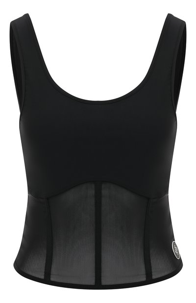 Черный топ с вставкой из сетки обеспечит комфорт во время активных тренировок. Модель плотно облегает фигуру и деликатно корректирует силуэт, подчеркивая талию. Такой эффект создают два слоя тонкого эластичного бифлекса, который хорошо тянется и при этом не теряет форму.