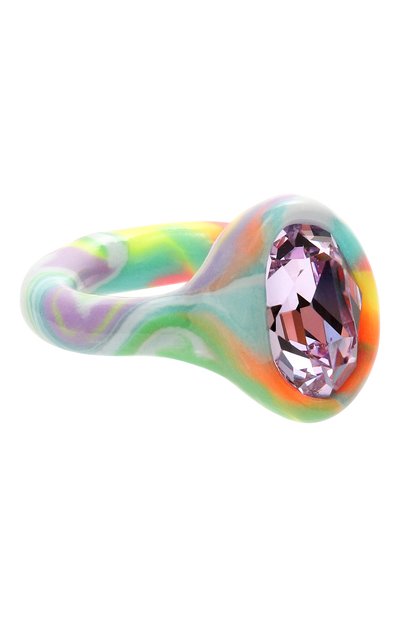 Кольцо, выполненное вручную из полимерной глины, словно позаимствовало палитру у разноцветного леденца. На красочном фоне еще эффектнее смотрится крупный сиреневый кристалл, выразительно сияющий на свету. В готовом виде изделие покрыли глянцевым лаком, который защищает поверхность от царапин и потемнений.
