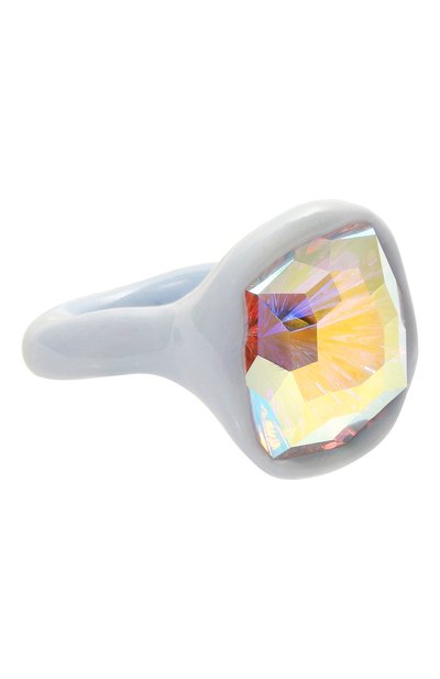 Акцентное кольцо притягивает внимание многогранным сиянием крупного камня, выразительно сияющего в солнечных и электрических лучах. Фоном для него стала полимерная глина светлого голубоватого оттенка. После обжига модель ручной работы покрыли тонким слоем глянцевого лака, который защищает поверхность от царапин и сколов.