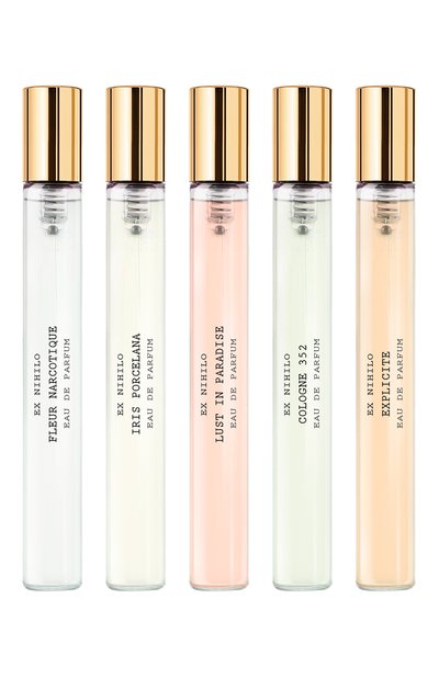 Каждый из пяти флаконов-миниатюр (по 7,5 мл) в наборе Temptation наполнен одним из культовых цветочных ароматов. Гипнотический Fleur Narcotique дурманит коктейлем из личи и персиков с нежными лепестками пионов и флердоранжа. Лейтмотив воздушного Iris Porcelana — пудровые ирисы. В ярком Lust in Paradise нота пеларгонии покоится на древесно-амбровом облаке. Прохладный Cologne 352 соткан из благоухания ландышей и зелени. А в Explicite бутоны украшают сладкий сливочно-ореховый десерт.