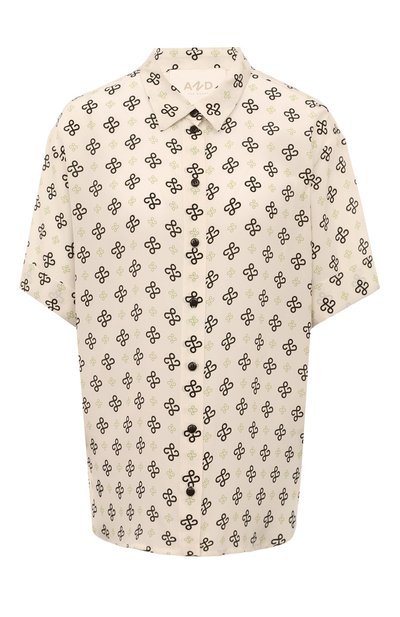 Сочетание спущенной линии плеч и коротких рукавов придают кремовой рубашке с отложным воротником расслабленный вид. Тонкий струящийся шелковый креп с паттерном из эмблем марки создает комфортный для тела микроклимат и приятно ощущается на коже. Прямую модель с боковыми разрезами наши стилисты предлагают носить с брюками и шлепанцами.
