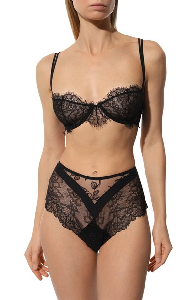 При создании слипов использовали стрейчевые материалы разной фактуры. Основу выполнили из нежного ливерсного кружева с цветочным мотивом и фестончатым краем, а для вставок выбрали воздушный полупрозрачный тюль. Тщательно проработанные швы не ощущаются на теле.