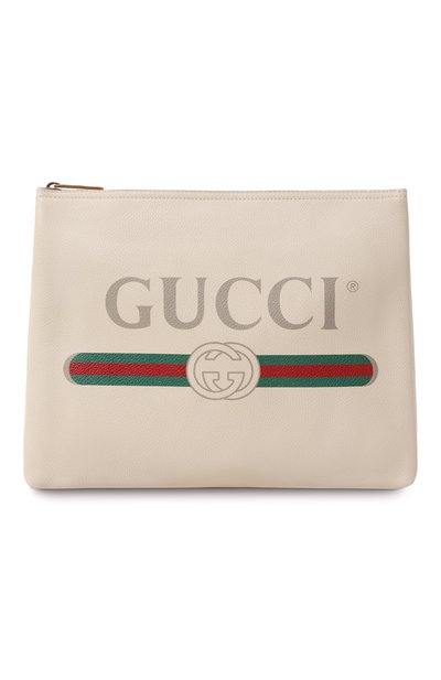 Для производства кремового клатча прямоугольной формы мастера марки использовали мягкую прочную кожу с зернистой фактурой. Материал обработали по технологии тонкой выделки, чтобы он стал достаточно пластичным и на нем не появлялись заломы. Принт спереди выполнили в виде монограммы GG на фоне знаковой ленты Web.