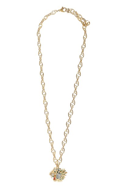 Колье с крупными вензельными звеньями изготовили из ювелирного сплава, отполированного до глянцевого блеска. Символичную для бренда голову тигра, напоминающую знаменитую брошь, созданную Хэтти Карнеги в 1940-х, покрыли цветной эмалью и украсили кристаллами. Небольшую подвеску в виде монограммы GG из инициалов Гуччио Гуччи прикрепили к замку-карабину.