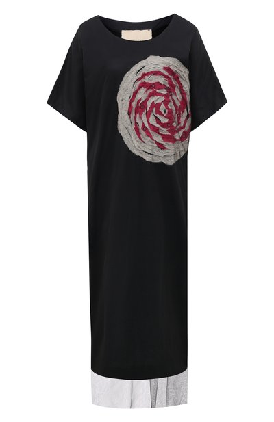 Для пошива черного платья мастера бренда использовали легкую плотную ткань, сотканную из длинных волокон льна и нежного хлопка. Модель украсили кварцевыми камнями и крупным цветком розы, выполненным из переплетенных необработанных текстильных лент бежевого и розового оттенков. Полупрозрачный тюль в тон дублирует изделие, как чехол.