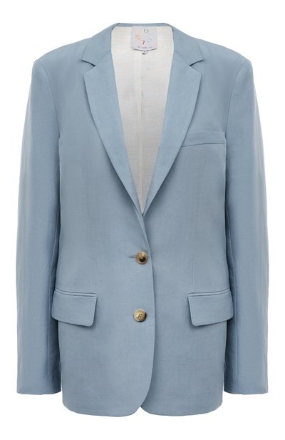 В однобортном жакете пастельно-голубого цвета будет комфортно и теплым днем, и прохладным вечером. Прямую модель сшили из тонкой ткани из смеси прочного лиоцелла и льна, который поддерживает необходимую для тела терморегуляцию в разных погодных условиях. Изделие из такого материала легче костюмных аналогов, но также хорошо держит четкость линий кроя и почти не мнется.