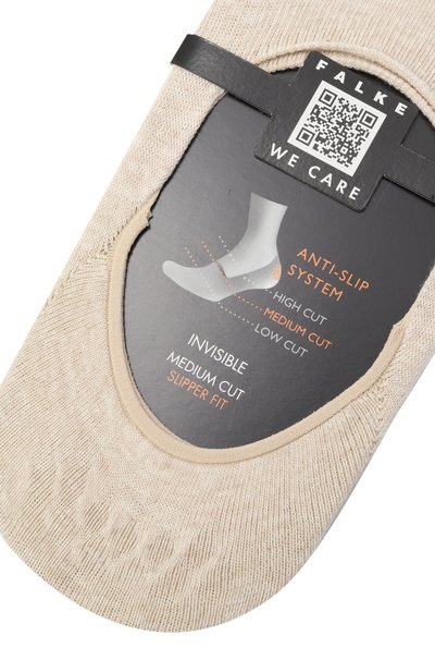 Бежевые подследники можно носить под обувью с глубоким вырезом. Для создания аксессуара использовали тонкий эластичный трикотаж на основе органического хлопка, который отлично пропускает воздух и быстро испаряет влагу. Усиленные зоны мыса и пятки обеспечивают долговечность изделия.
