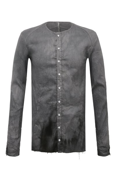 Для создания темно-серой рубашки с круглым вырезом и утрированно длинными рукавами использовали тонкую льняную ткань. Переплетение гладких волокон, обладающих терморегулирующими свойствами, придало дышащему материалу деликатный блеск. Расслабленным изделие делают специально необработанный низ и неравномерный оттенок, полученный окрашиванием в готовом виде.