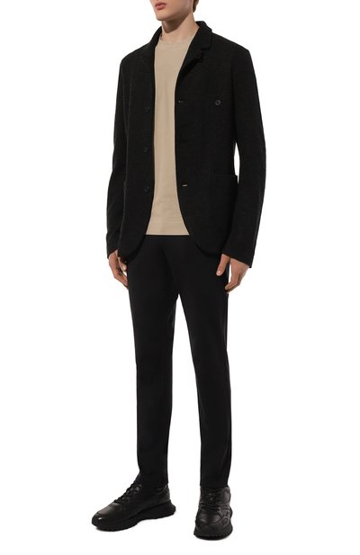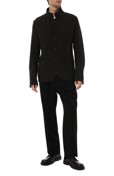 Черный пиджак станет органичным завершением образа с брюками, футболкой и слипонами. Для прогулок в теплую погоду модель адаптирует эластичный материал из гладких льняных волокон, обладающих терморегулирующими свойствами. Изделие дополнили отложным воротником, который можно поднять, превратив в стойку.