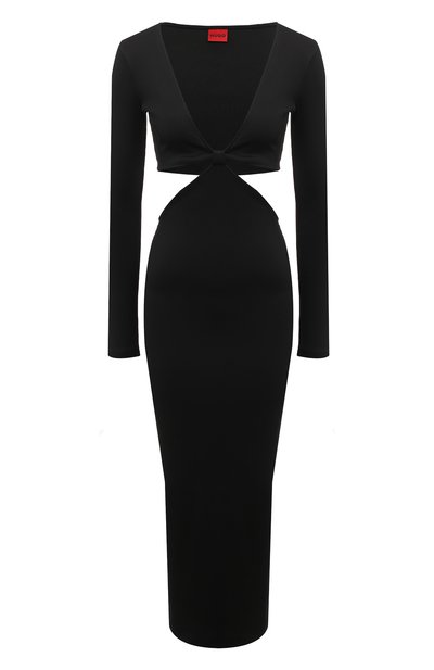 Черное платье напоминает комплект из кроп-топа и миди-юбки. Сходство создает вырез, открывающий талию, который спереди подчеркнули объемным узлом. Мастера марки, основанной Хуго Фердинандом Боссом, выполнили модель из фактурного мягкого трикотажа с фактурным узором в виде полос.
