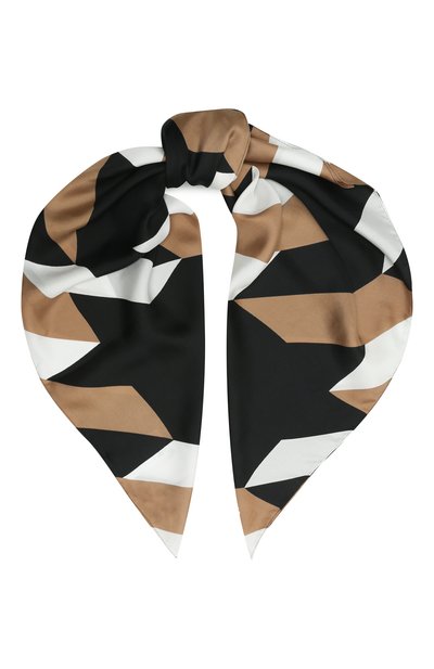 Мастера марки сшили платок из тонкого шелкового твила с крупным графичным принтом. Аксессуар из такого текстиля с деликатным блеском ложится безупречными складками, но не сминается, быстро восстанавливая форму. Размера трехцветной модели хватит, чтобы повязать ее вместо кроп-топа.