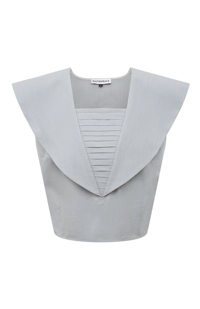 Для пошива серого легкого топа мастера бренда использовали мягкую тонкую ткань, сотканную из тщательно отобранных хлопковых волокон и гладкого льна, обладающего терморегулирующими свойствами. Модель дополнили широким, напоминающим гюйс, воротником, закрывающим спину и плечи. Декоративные складки на этой детали сзади повторили на V-образной вставке спереди.