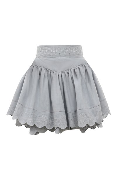 Голубая многоярусная юбка придаст образу легкость и воздушность. Модель с расклешенными воланами сшили из тонкого мягкого текстиля, который хорошо драпируется. В материале соединили нежный хлопок и гладкий лен, поэтому в такой вещи не будет жарко даже в зной. Вышитая отделка с фестонами по краям, усиливающая романтичность изделия, рифмуется с широким поясом, концы которого завязываются объемным бантом сзади.