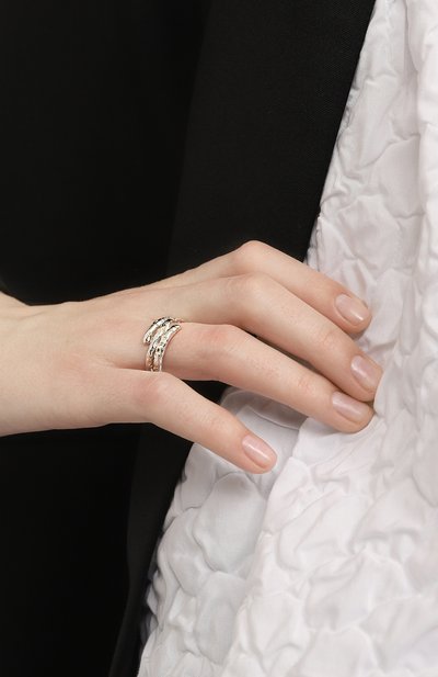 Широкое незамкнутое кольцо почти полностью закрывает фалангу. Менее массивным изделие делает крупный ажурный каст в виде розы, на лепестках которой словно сияют капли из раухтопаза. Для изготовления аксессуара использовали серебро 925 пробы, покрытое темной патиной для винтажного эффекта.