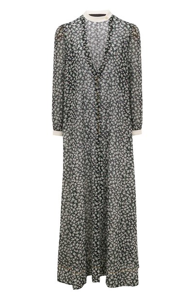 На первый взгляд миди-платье с длинными рукавами может показаться довольно сдержанным, но фигурное декольте, высокий разрез на подоле и мелкий цветочный принт компенсируют это впечатление, добавляя модели романтичности. Для пошива изделия использовали тонкую хлопковую ткань, которая красиво струится в движении и обеспечивает комфорт даже в жаркую погоду. С белой лентой, подчеркивающей шею, рифмуются манжеты в тон.