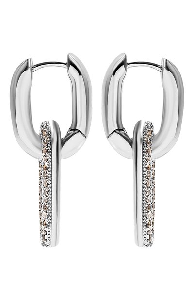 Серебристые серьги изготовили в виде двух звеньев. Верхнее, играющее роль основания, отполировали до зеркального блеска, а подвеску более крупного размера усыпали с одной стороны миниатюрными цирконами, создающими множество бликов. Для производства украшения использовали легкий ювелирный сплав с родиевым покрытием.