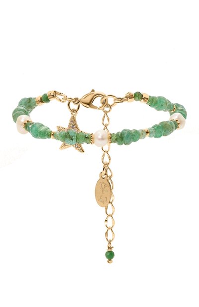 Зеленый гибкий браслет с изумрудами и жемчужинами изготовлен вручную из гипоаллергенного ювелирного сплава и покрыт тонким слоем золота. Легкое украшение, длина которого регулируется при помощи дополнительных звеньев, дополнено подвеской-морской звездой с россыпью сверкающих кристаллов.
