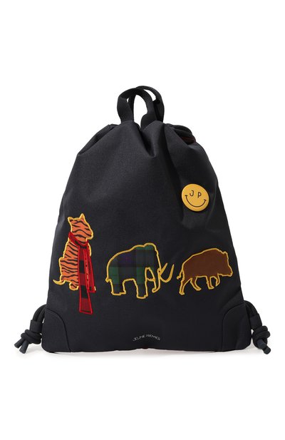 Темно-синий рюкзак с красной клетчатой спинкой декорировали аппликациями в виде животных и значком-см айлом. Для изготовления модели использовали ультрапрочную легкую ткань из полиэфирного волокна, которая отталкивает влагу и не требует особенного ухода. Основное отделение с карманом на молнии затягивается сверху кулиской с толстыми шнурами, одновременно играющими роль лямок.