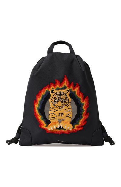 Для пошива темно-синего рюкзака с двумя короткими ручками использовали прочную непромокаемую ткань, которую легко очистить от загрязнений. Яркий разноцветный патч в виде тигра подчеркнули фактурной вышивкой. Аксессуар затягивается витыми шнурами, продетыми в кулиски вдоль верха, которые также играют роль лямок.