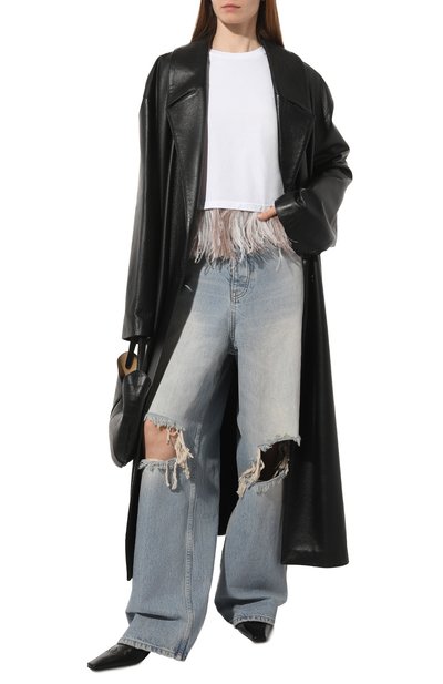 Эксперименты с кроем превратили базовую футболку из белого хлопкового трикотажа в отличный способ подчеркнуть талию. Модель стала короткой, как кроп-топ, и одновременно утрированно свободной, поэтому визуально уменьшает пропорции тела. С силу этом перекликается крупный нагрудный карман, а текстильный треугольник сзади намекает на принадлежность бренду, основанной Марио Прада.