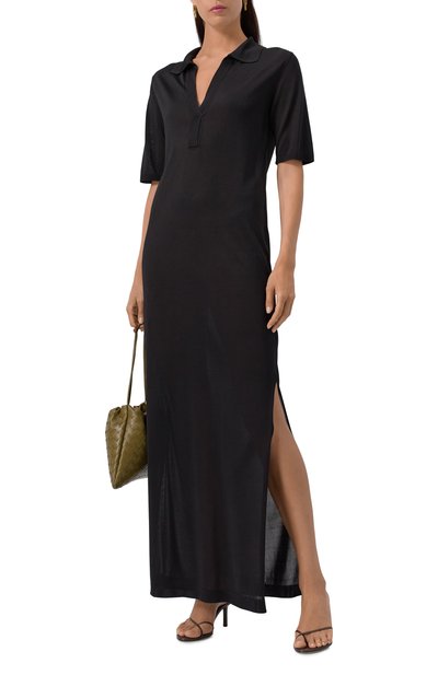 Черное платье с воротником аскот мастера бренда, основанного Марио Прада, выполнили из легкого в меру плотного материала, произведенного из волокон ацетата и вискозы. Лиф и линию талии модели дополнили эластичными вставками, формирующими легкую драпировку. Ей вторят складки на коротких объемных рукавах, поддерживающие романтичный вид изделия со встречной молнией спереди.