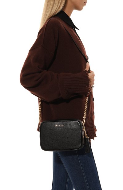 Небольшая сумка Emma получилась максимально функционально й. Дело не только в универсальном черном цвете и лаконичном силуэте без акцентных деталей, но и в бежевой косметичке, которая вошла в комплект. Для изготовления обоих аксессуаров использовали фактурную матовую кожу. Их можно носить как вместе, так и по отдельности.