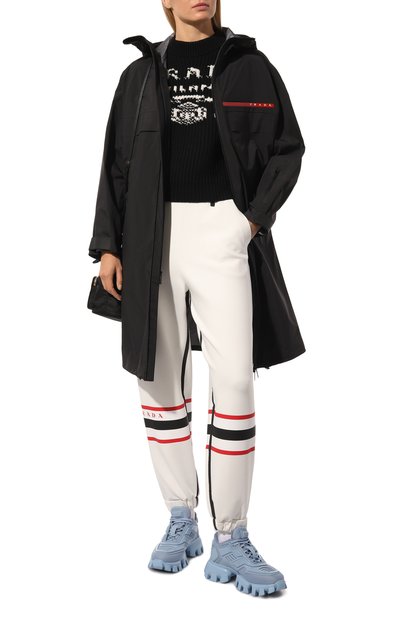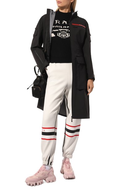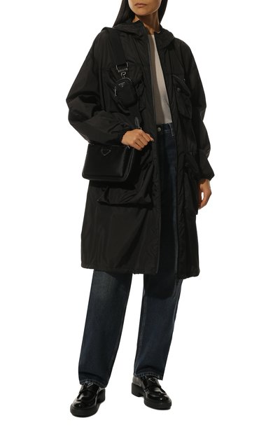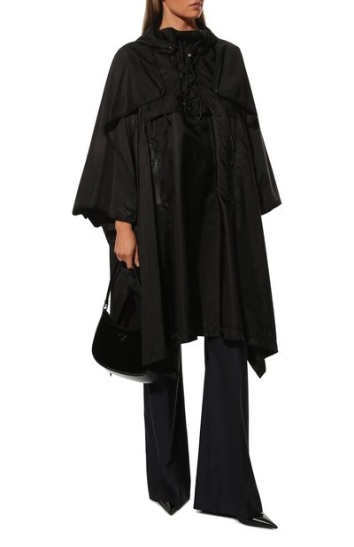 Плащ с эластичными манжетами выполнили из вторичного габардина Re-Nylon. Модель дополнили нагрудным и боковыми карманами, а еще один накладной с фирменным треугольником на клапане разметили на спинке. В комплекте — съемный пояс с пряжкой фастекс.