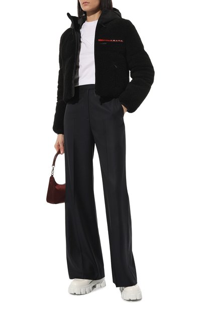 Треугольная эмблема бренда, основанного Марио Прада, на короткой черной куртке обрела функциональный смысл. Она превратилась в геометричный нагрудный карман, похожий на футляры с ремней фирменных сумок. Трехмерную деталь выполнили из того же переработанного нейлона Re-Nylon, что и саму модель с кулиской на поясе. В шелковистом те кстиле тонкость сочетается с прочностью, поэтому изделие почти ничего не весит и при этом отлично защищает от непогоды.