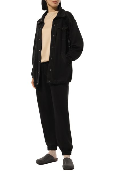 Мастера бренда, основанного Марио Прада, выполнили черную куртку из тонкого нейлона Re-Nylon, переработанного из пластикового мусора и сетей, выловленных в океане. Такой подход к выбору материала помог сэкономить первичные ресурсы и снизить углеродный след. Спереди модель с отложным воротником декорировали крупным белым логотипом. Низ затя гивается шнуром, продетым в кулиску.