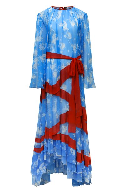 Для изготовления синего макси-платья с белым мотивом Ульяна Сергеенко выбрала полупрозрачный шелковый шифон, ложащийся мягкими складками. Асимметричный расклешенный подол декорировали контрастными оборками алого цвета, оттенок которых поддерживают пояс-лента и отделка вдоль круглого выреза.