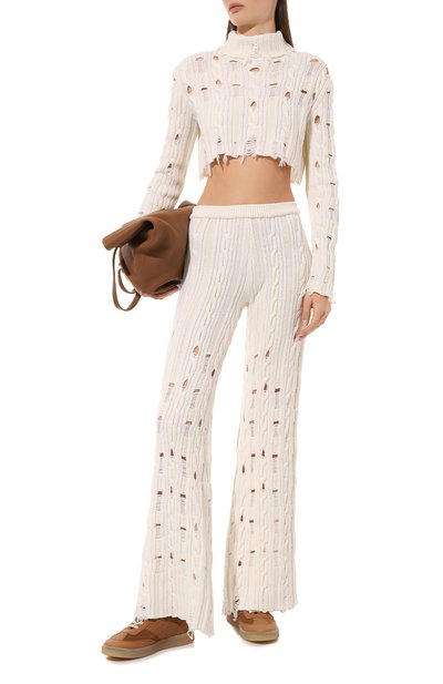 Продолжая эксперименты с трикотажем, мастера марки связали эти брюки из мягкой шерстяной пряжи арановым узором. Нотку бунтарства в комфортную модель вносят сквозные отверстия и спущенные петли, которые украшают брючины. Наши стилисты предлагают сделать высказывание еще более ясным, дополнив изделие парным укороченным свитером.