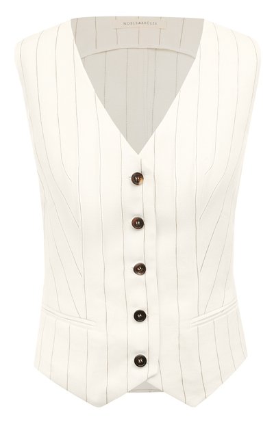 Кремовый жилет в узкую вертикальную полоску оттенка хаки сшили из тонкой льняной ткани. Легкий материал отлично пропускает воздух и быстро отводит влагу, поэтому в модели будет комфортно в теплую погоду. Графичность изделию классического кроя добавляют контрастные пуговицы.