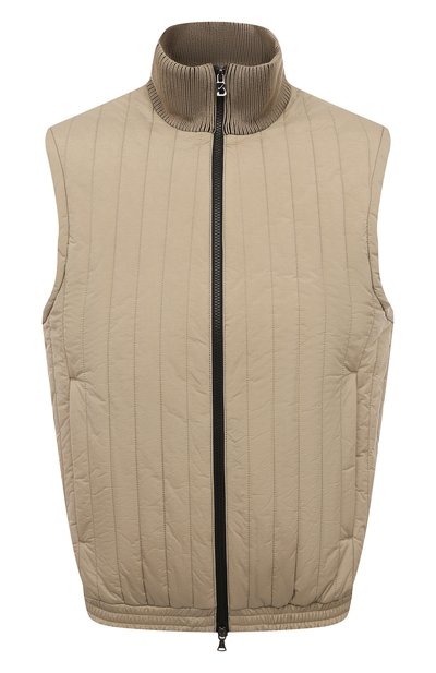 Бежевый стеганый жилет с воротником-стойкой сделает более комфортными как прогулки в городе, так и отдых на природе. Модель из тонкого, шелковистого на ощупь нейлона хорошо удерживает тепло, почти ничего не весит и идеально очищается от загрязнений. Для изготовления материала использовали переработанные волокна полиамида, что позволило сэкономить первичные ресурсы.