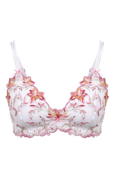 Бюстгальтер с мягкими чашечками выглядит так, будто его соткали из розовых цветочных бу тонов. Эффект создает нежная растительная вышивка, которую бережно выполнили на полупрозрачном тюле. В состав этого материала включили стрейчевые волокна, чтобы белье комфортно облегало фигуру.