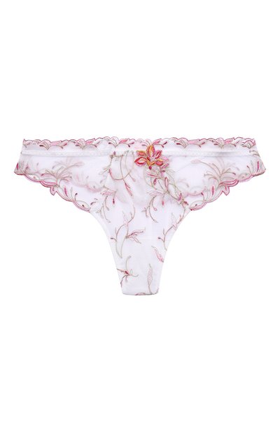 Для изготовления стрингов с розовой вышивкой, вдохновленной цветами азалии, мастера марки использовали полупрозрачный тюль. Нежный материал с добавлением эластана мягко облегает силуэт. Фигурный пояс сзади дополнили вставкой из узкой ленты, подчеркнутой миниатюрным бантом.