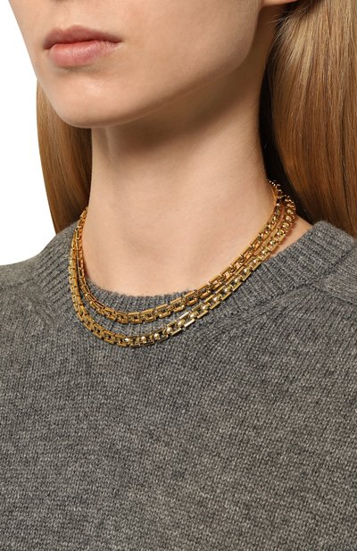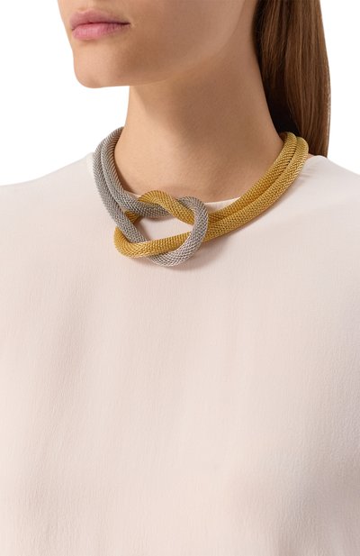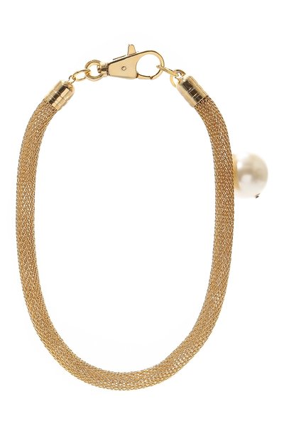Колье-чокер выполнили из латуни с покрытием 14-каратным золотом. Длина аксессуара регулируется карабином и цепочкой с подвеской из крупной жемчужной бусины.