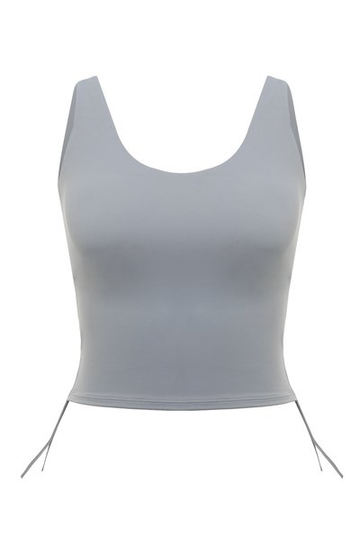 Для изготовления серого топа мастера марки использова ли мягкий прочный нейлон. В состав добавили гладкие волокна спандекса, поэтому материал легко тянется во все стороны, а изделие плотно облегает фигуру. Съемные формованные чашечки обеспечивают оптимальную поддержку груди. Шнурки в боковых кулисках формируют драпировку, подчеркивающую силуэт.