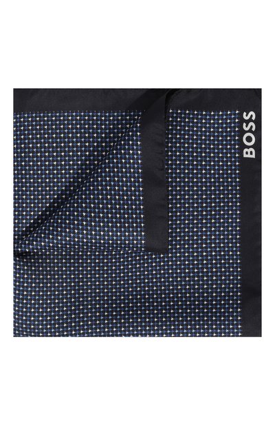 Квадратный нагрудный платок с трехцветным паттерном «гусиная лапка» в синих тонах изготовили из мягкого шелкового твила. Тонкий, но вместе с тем прочный материал не мнется, хорошо драпируется и держит форму. На принадлежность марке указывает белый логотип на широкой однотонной кайме.