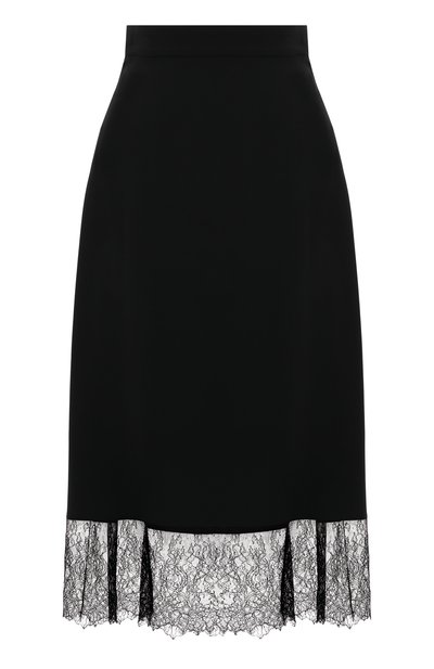 Черная миди-юбка в исполнении Игоря Чапурина выглядит так, будто ее надели поверх другой вещи. Такой эффект создает вставка из тонкого ажурного кружева с фестончатым краем. Для пошива слегка расклешенной модели мастера марки использовали легкий гладкий шелк. Предлагаем дополнить коктейльный образ топом и босоножками в тон.