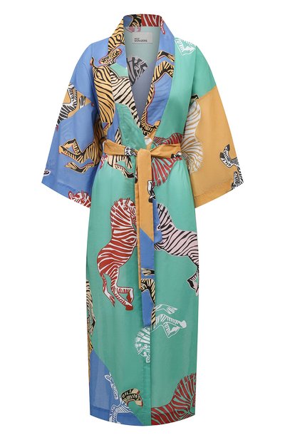 Для пошива халат а с укороченными широкими рукавами мастера марки использовали тонкий мягкий хлопок с крупным разноцветным принтом в виде зебр. Легкий материал хорошо пропускает воздух, почти не ощущается на теле и не перегревает кожу, поэтому в модели будет комфортно во время домашнего отдыха. Изделие дополнили поясом-лентой, позволяющим регулировать глубину запаха.