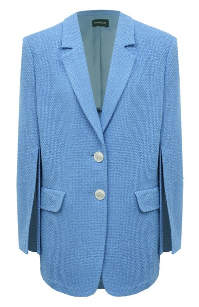 Швы на рукавах однобортного синего жакета остались незавершенными и эффектно обнажили руки до локтя. Акцентным деталям вторят высокие боковые разрезы, которые заменили привычные для такой одежды шлицы. Плотный фактурный текстиль из хлопка и вискозы делает каждую линию предельно четкой, поэтому крой выглядит особенно выразительно.
