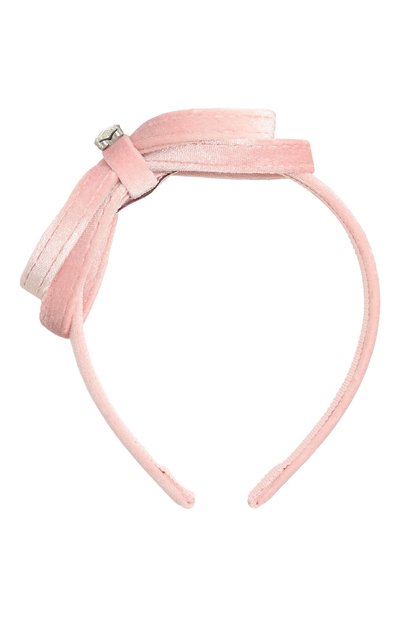 Светло-розовый узкий ободок мастера марки выполнили вручную из мягкого бархата, обтянув этим текстилем гибкое прочное основание. Такой же материал использовали для изготовления крупного двойного банта, середину которого подчеркнули мерцающим кристаллом в форме сердца.