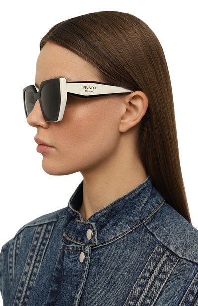 Тонкая белая кайма делает черную металлическую оправу еще более графичной. Крупные темно-серые линзы полностью блокируют ультрафиолетовые лучи А- и В-спектров, делая модель подходящей для отдыха на побережье. О принадлежности бренду говорит элемент знакового треугольника с логотипом марки, который расположили на дужках.