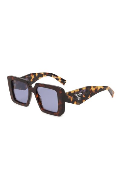 Коричневые солнцезащитные очки квадратной формы добавят образу ретро-тон. Для изготовления аксессуара с широкими ободами использовали легкий прочный акрил черепаховой расцветки. Фигурные дужки на пару тонов светлее инкрустировали вставками в виде знакового треугольника. С их сиреневым оттенком рифмуются линзы, на 100% блокирующие УФ-лучи.