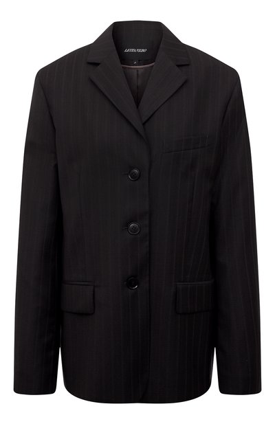 Этот однобортный жакет Олеся Шиповская сделала предельно строгим. Дизайнер задала нужный тон прямым кроем с четкими плечами и усилила впечатление костюмной шерстью темного коричневого оттенка. Ткань издали выглядит гладкой, а вблизи раскрывает слегка фактурный рисунок, в котором шевронный узор чередуется с узкой полоской.