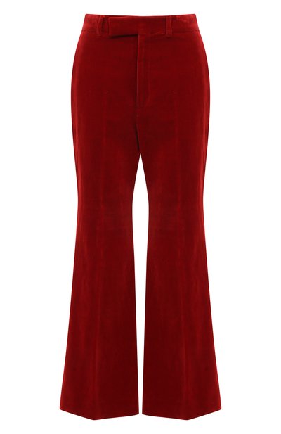 Расклешенные красные брюки – оммаж одежде, впервые появившейся на показе коллекции 1996 года. Для пошива модели с высокой посадкой дизайнер марки, основанной Гуччио Гуччи, выбрал мягкий хлопково-льняной бархат, фактура которого делает насыщенный цвет изделия особенно глубоким. Сыграть на контрасте материалов поможет блуза из гладкого блестящего атласа.