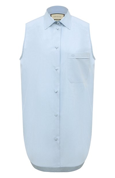 Свободную небесно-голубую рубашку без рукавов мастера марки сшили из тонкого дышащего хлопка. Материал с плотным переплетением гладких нитей получился прочным, приятным на ощ упь и почти немнущимся, поэтому изделие будет долго сохранять свежий вид. Единственный декор лаконичной модели – миниатюрная знаковая монограмма из инициалов Гуччио Гуччи, вышитая нитью в тон на накладном нагрудном кармане.