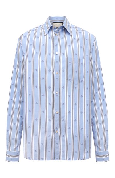 Мелкий паттерн в виде знаковой для марки, основанной Гуччио Гуччи, пчелы снижает градус формальности этой голубой полосатой рубашки с длинными рукавами и отложным воротником. Для пошива модели использовали тонкий шелковистый хлопок, который сохраняет свежий вид в течение всего дня. Фигурный низ позволяет носить из делие и навыпуск, и заправив за пояс брюк.