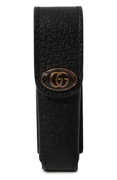 Компактный футляр для губной помады сшили из плотной угольно-черной кожи с мелким тиснением. Матовый материал оттеняет блеск металлической пластины с монограммой GG, покрытой прозрачной эмалью аметистового цвета. Декор скрывает кнопку на узком клапане со съемной цепочкой, которая позволяет носить аксессуар на шее.